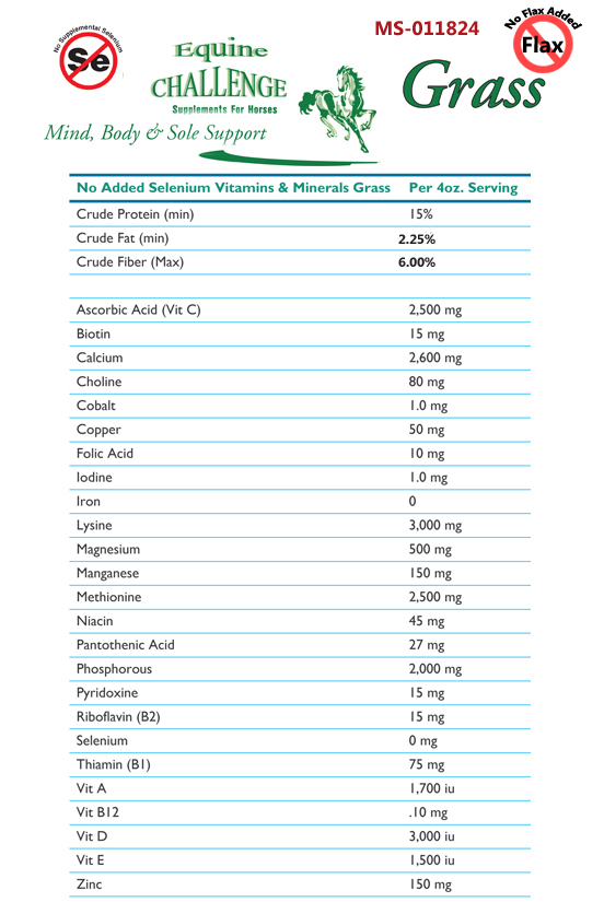 No Added Selenium No Flaxseed Horse Supplement Vitamin & Mineral Grass is formulated for horse owners looking for a vitamin, mineral supplement which contains no selenium and no flax. This supplement contains elevated amounts of Lysine given the low levels of Lysine found in grasses. Seven strains of viable Bacillus and Lactobacillus bacteria make an effective pro-biotic that can be easily incorporated into your supplementation program. The microbial sources are guaranteed to provide bacteria that are both viable and effective in promoting intestinal well being. One of our seven microbes, Lactobacilluls Plantarum will synthesize Lysine in the gut of the horse. Biotin, minerals and amino acids build strong healthy hoof horn and beautiful coat condition. Equine Challenge™ Grass delivers omega-3 fatty acids, antioxidants, vitamins, trace minerals & probiotics that are readily absorbed in your horse’s digestive system. For all horses consuming grass or mixed grass hay. Balances forage based diets and corrects nutritional gaps in hay and pastures.