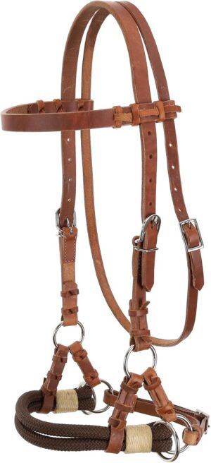 The brown para cord double rope noseband provides a snug yet soft contact point, offering just enough pressure for clear cues without the harshness. With two rein ring attachments, it gives you direct lateral control—making it ideal for green horses, sensitive mouths, or riders working on refined groundwork and riding communication.